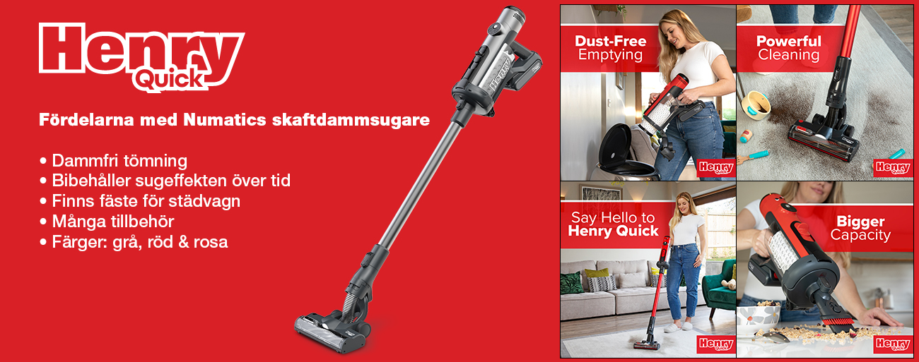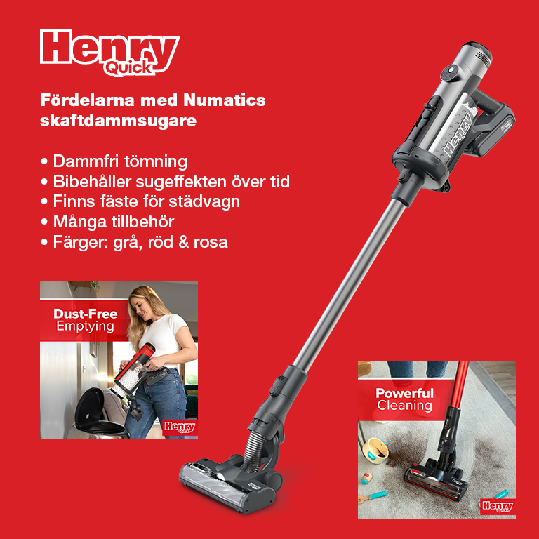 Skaftdammsugare Henry Quick. Dammfri tömning, kraftfullt sug med turbo funktion.