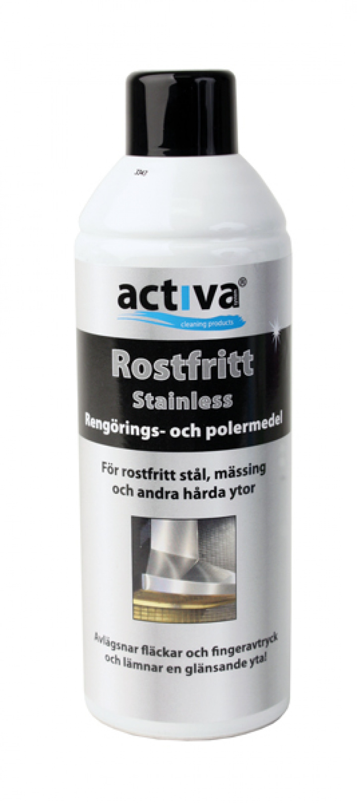 Activa Rostfritt Aerosol är ett lättanvänt rengörings- och polermedel för rostfritt stål, mässing och andra hårda ytor.Produkten avlägsnar fläckar, fingeravtryck och liknande orenheter. Lämnar en glänsande yta som också skyddar mot nya fläckar. Används till köks- och restaurangmaskiner, hissar, räcken etc. Innehåller 520 ml.